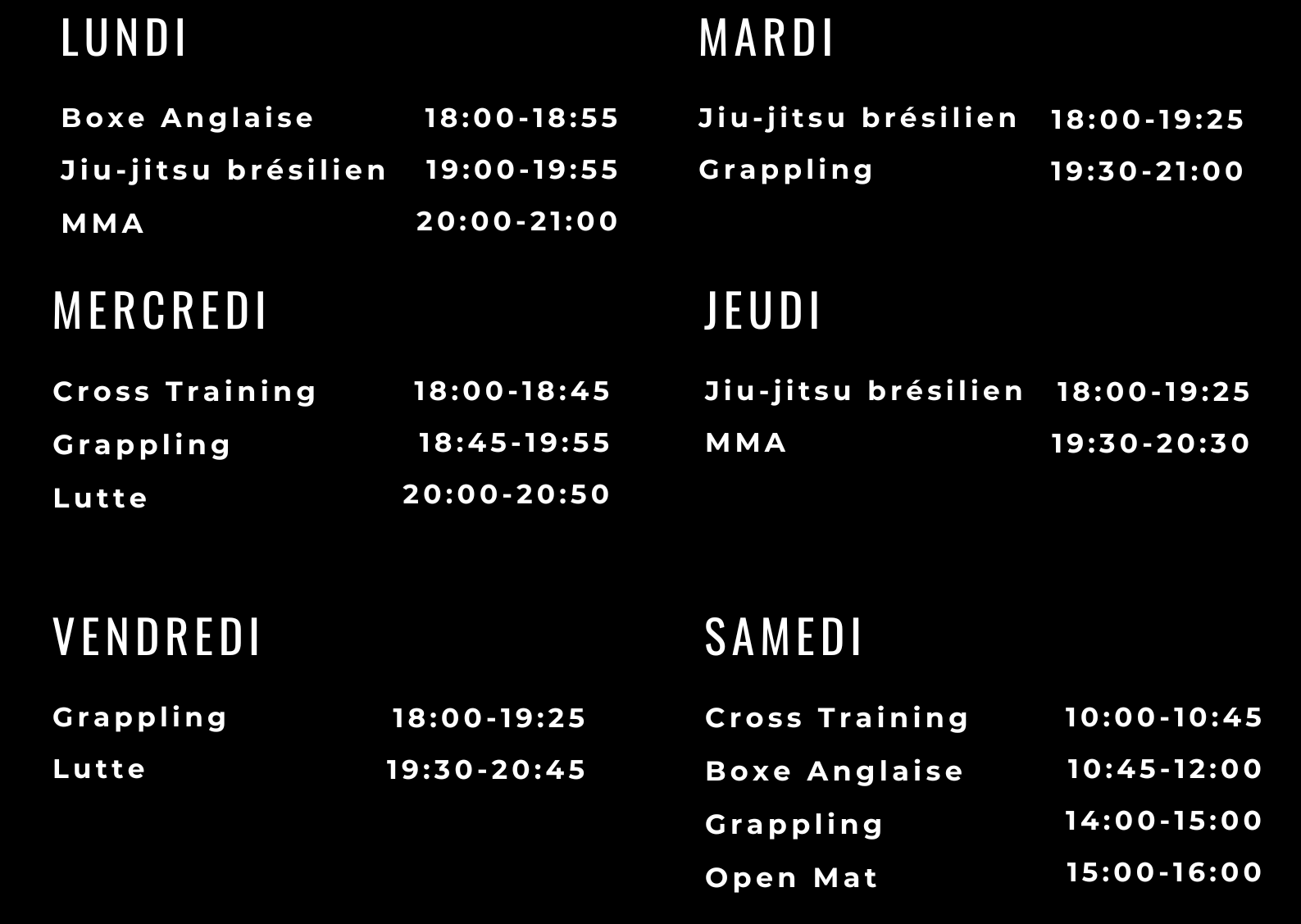 Chez nous, vous découvrirez une équipe d’entraîneurs hautement qualifiés, dédiée à votre progression personnelle et sportive. Que vous soyez attiré par la boxe, le kickboxing, le MMA ou les arts martiaux traditionnels, nous mettons à votre disposition des équipements de qualité et des programmes adaptés à vos objectifs spécifiques.